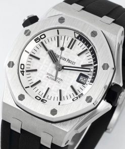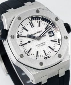 Audemars Piguet Royal Oak Offshore Diver. Automatisch mechanisch uurwerk met AP Cal.3120. 316L roestvrijstalen kast met geborstelde en gepolijste afwerking. Saffierglas met anti-reflecterende coating. Rubber band met roestvrijstalen pin buckle. Super-LumiNova wijzers en markeringen.