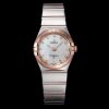 Omega Constellation met een 27.4mm roestvrijstalen kast, voorzien van een 1376 kwartsuurwerk. De parelmoer wijzerplaat is versierd met 8 VS diamanten en Romeinse cijfers, beschermd door saffierglas, gecombineerd met een stalen band.