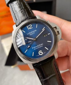 Panerai Luminor serie herenhorloge met een 44mm kast en automatisch mechanisch uurwerk. Voorzien van een 316L roestvrijstalen kast en gecoat glas. Uitgerust met een kalfsleren band en originele pinsluiting. Combineert robuust design met precisie.