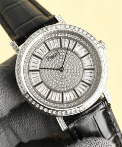 Piaget Polo horloge. 41mm 18K witgouden kast met diamant-beslagen bezel. Handmatig ultradun uurwerk met transparante achterkant kast.