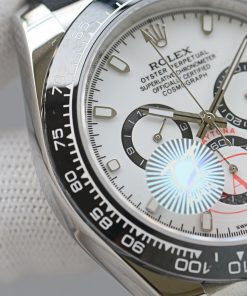Rolex Cosmograph Daytona. Automatisch mechanisch uurwerk met chronograaffuncties. 40mm kast in 316L roestvrij staal met zwarte keramische lunette en tachymeterschaal. Wijzerplaat met lichtgevende Chromalight weergave en verhoogd logo. Saffierglas met anti-reflecterende coating en Cyclops lens op 6 uur met Rolex anti-namaak kroon.