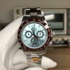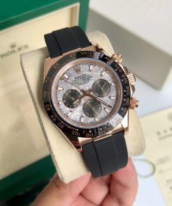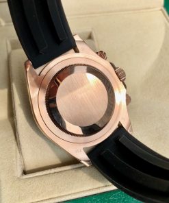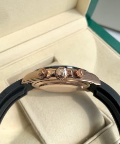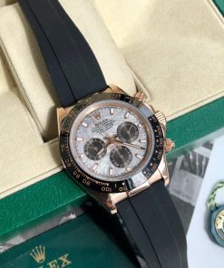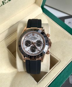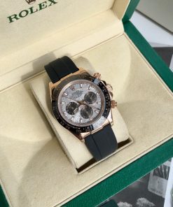 Rolex Cosmograph Daytona. 40mm 316L roestvrijstalen kast met gepolijste keramische lunette. Krasbestendig saffierglas. Aangedreven door automatisch mechanisch uurwerk. Roestvrijstalen band met hoogwaardige rubberen band.