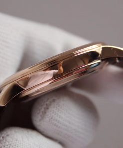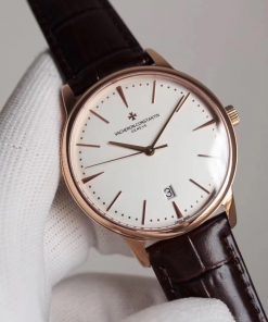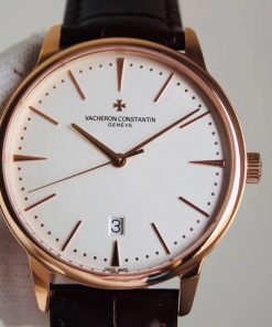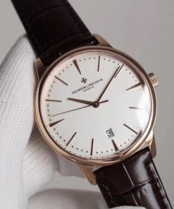Vacheron Constantin Patrimony met een elegant design. Voorzien van een 40mm rozegouden kast, een gepolijste kroon, en een saffierkristal met een datumvenster op 6 uur. Uitgerust met een 9015 uurwerk en een Italiaanse kalfsleren armband.